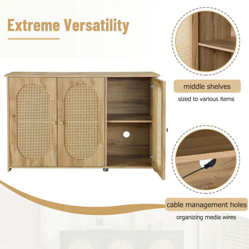 Classic vintage-style 3-door sideboard with large storage, faux rattan doors, and metal handles. Features cable management, adjustable shelves, and sturdy particleboard/MDF construction. Works as a living room, hallway, or dining room cabinet in a natural wood look. Assembly required.